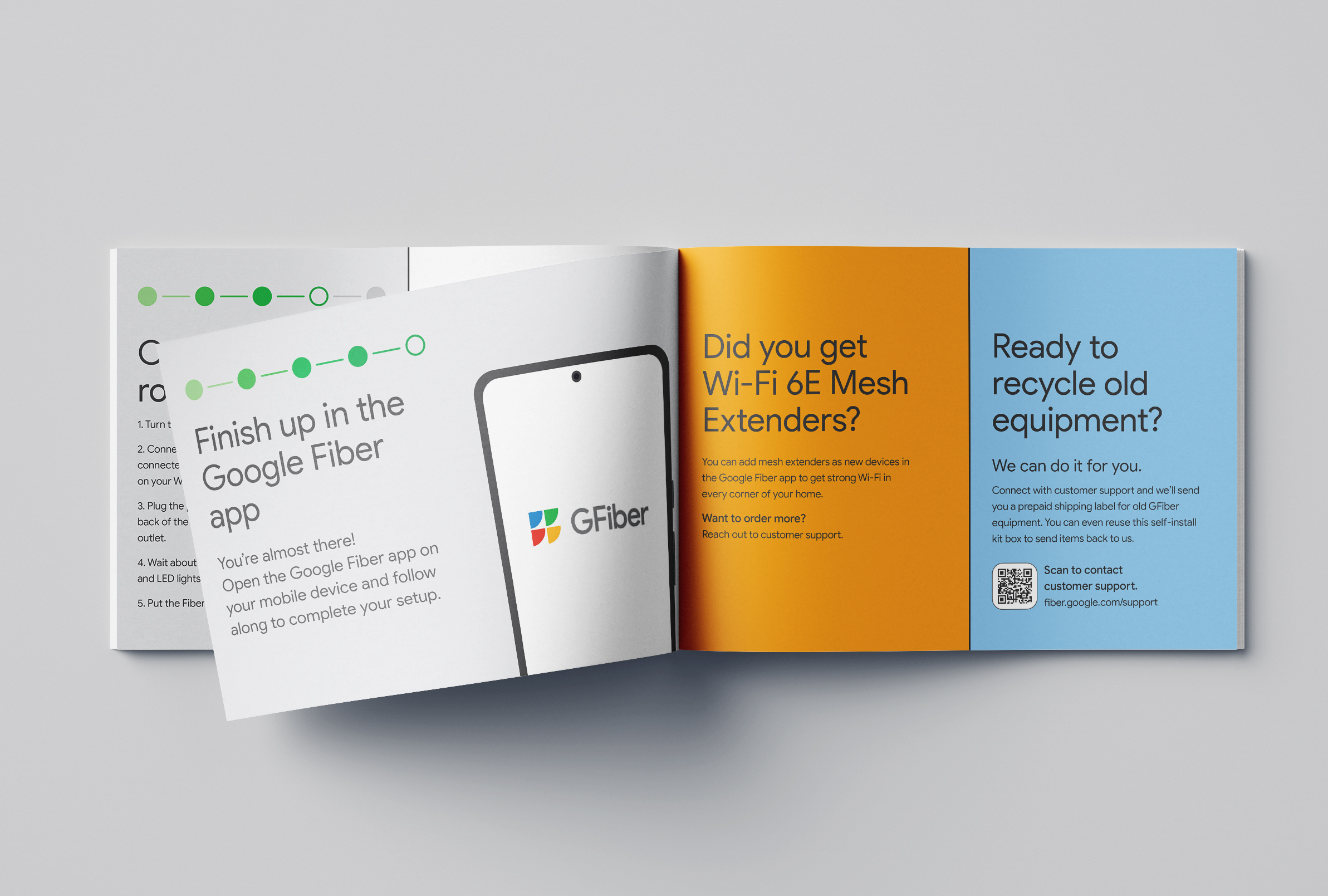 I worked with GFiber’s Product Marketing team and copywriter to redesign the existing self-install kit (SIK) instruction guide. The previous guide was dense with copy and visually hard to follow. Since this kit is sent to customers installing their own Wi-Fi, it was imperative to be as clear and user-friendly as possible. I created a color-coded booklet system, with step-by-step instructions, simple illustrations and plenty of QR codes along the way.